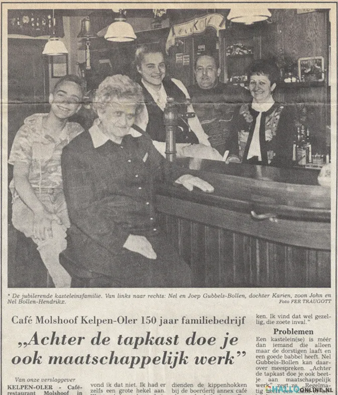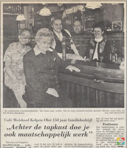 Terug in de tijd nu weer, want dik twee eeuwen na de tijd van Jan Mols, in 1843, begon Peter Laurens Hendrikx (ook wel Mols Pierre) in de boerderij dus een café. Hij was de overgrootvader van Nel Gubbels-Bollen die in 2018 nog altijd de scepter zwaait achter het buffet. Dat was ook al zo in 1993, toen De Molshoof het 150-jarig bestaan vierde. En ook toen was er al aandacht van de pers. Nel vertelt aan de hand van die oude artikelen wat er in de afgelopen 25 jaar gebeurd is.