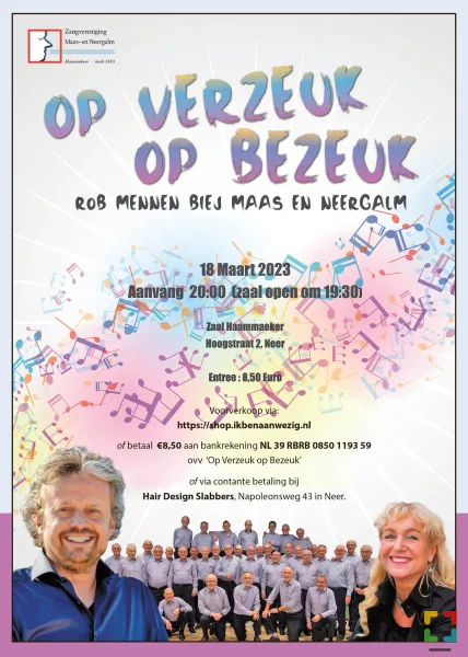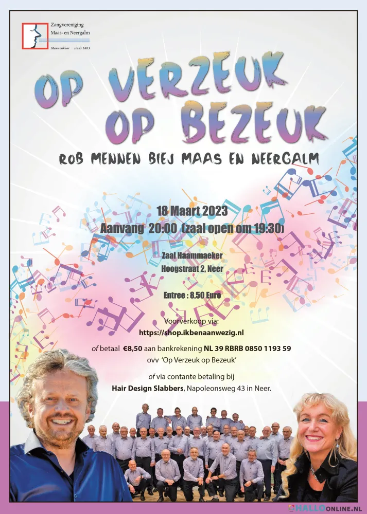 Zangvereniging Maas- en Neergalm uit Neer krijgt op zaterdag 18 maart bezoek van een creatieve, muzikale duizendpoot uit eigen provincie. Entertainer, pianist en zanger Rob Mennen uit Berg en Terblijt komt dan ‘Op Verzeuk op Bezeuk’ bij het mannenkoor uit Neer. In een voorstelling van twee keer vijftig minuten presenteert Rob Mennen in gemeenschapshuis D’n Haammaeker in Neer een vrolijk en onderhoudend programma.