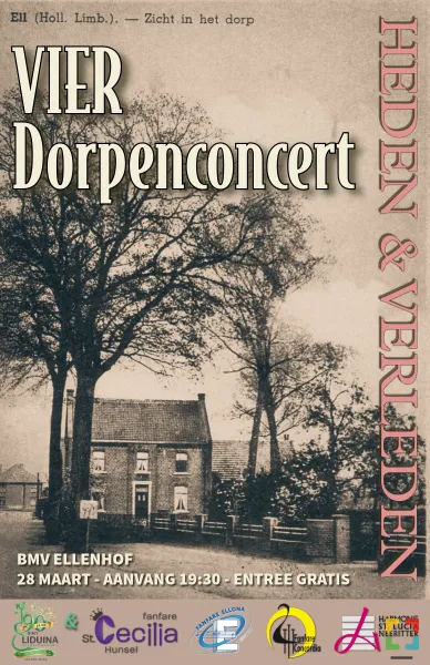 Op zaterdag 28 maart vindt in Ell het jaarlijkse 4-dorpenconcert plaats. Tijdens deze  bijzondere avond bundelen de muziekverenigingen uit de voormalige gemeente Hunsel hun  krachten en laten zij het publiek genieten van een veelzijdig programma rond het thema  ‘Heden en Verleden’.