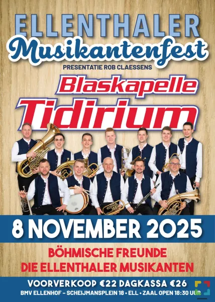 Op zaterdag 8 november 2025 vindt het 6e Ellenthaler MusikantenFest plaats in BMV Ellenhof, Ell. Geniet van een avond vol regionale en internationale blaasmuziek met optredens van: