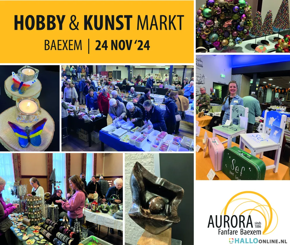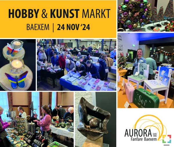 Fanfare Aurora organiseert ook dit jaar weer een Hobby- en Kunst markt. Deze gaat plaatsvinden op zondag 24 november 2024 in Baexheimerhof te Baexem. Het idee van deze indoor markt is dat deelnemers hun hobby- of kunst uitoefening demonstreren. Tevens kunnen gemaakte producten of kunstwerken worden aangeboden om te verkopen. De markt is toegankelijk voor bezoekers van 11-16 uur.