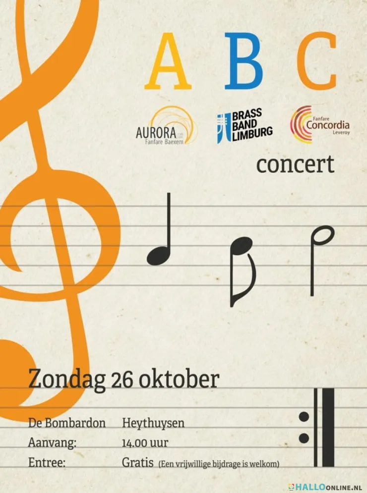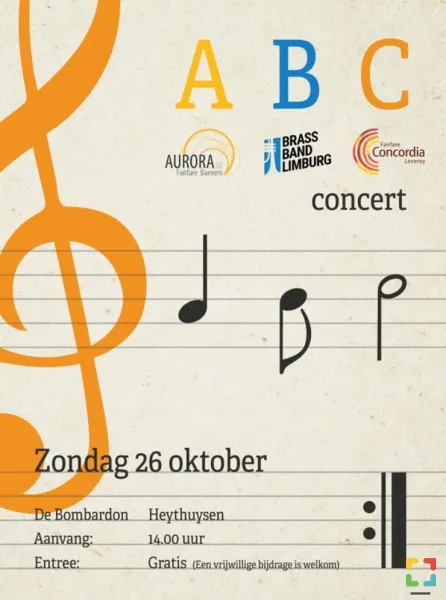 Fanfare Aurora Baexem, Brassband Limburg en Fanfare Concordia Leveroy geven zondag 26 oktober om 14.00 uur in Cultuurpodium Bombardon in Heythuysen een voorbereidingsconcert op hun respectievelijke concoursdeelnames.