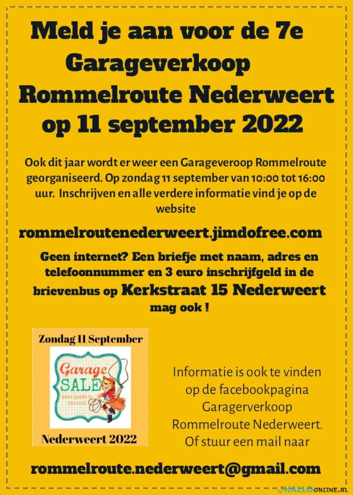 Na het grote succes van vorige jaren met in 2020 zelfs 270 deelnemende adressen organiseer ik op 11 September 2022 wederom voor de zevende keer een grote Garageverkoop Rommelroute in Gemeente Nederweert