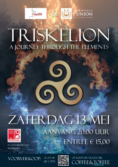 Harmonie L‘Union en Zanggroep Kazoo nemen u mee op een reis door de mystieke wereld van het Triskelion. Dit teken wordt in veel culturen gebruikt om een drie-eenheid aan te geven: aarde, zon en maan, maar ook vader, zoon en heilige geest, verleden, heden en toekomst, aarde, water en lucht, en geboorte, leven en dood. Beleef de magie van het Triskelion in een afwisselend programma van instrumentale en vocale muziek en laat u meevoeren door de Keltische, Griekse maar ook hedendaagse cultuur!