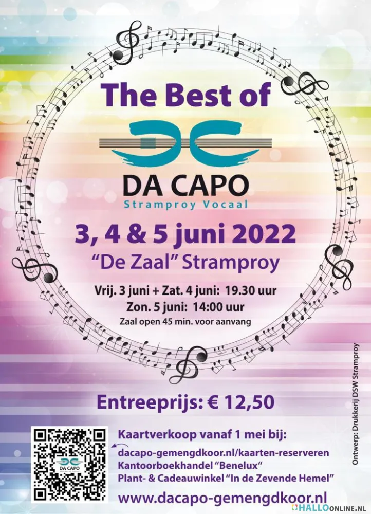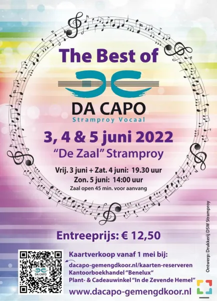 De uitvoeringen op 3 en 4 juni vangen aan om 19.30uur, de uitvoering op Pinksterzondag 5 juni start om 14.00 uur. Kaartjes á € 12,50 zijn verkrijgbaar bij kantoorboekhandel “Benelux” of bij Plant en Cadeauwinkel “In de Zevende Hemel”. Ook kunt u deze online bestellen. Ga daarvoor naar https://dacapo-gemengdkoor.nl/kaarten-reserveren/