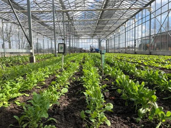 In de koude kas staan de onbespoten voorjaarsgroenten klaar voor de oogst. We telen twaalf maanden per jaar duurzaam groenten met hulp van zonne-energie, energiedoeken, een eigen waterput, een bassin voor hemelwater en een uitgekiend klimaatbesturingssysteem. Begin februari zijn in de kas in de volle grond 3000 plantjes gezet, waaronder raapstelen, paksoi, sla, winterpostelein en spinazie.