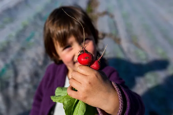 Zie hoe in de kas de onbespoten voorjaarsgroenten al bijna oogstrijp zijn. Wil je wandelen langs de akkers en genieten van de eerste bloeiende fruitbomen?