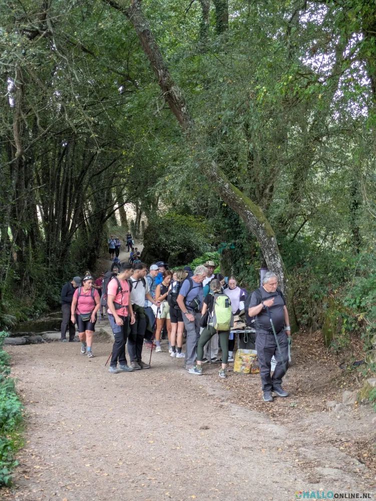 Het is, of het lijkt zo, iets minder druk dan gisteren. Je ziet verschil in de wandelaars die de laatste 100 km lopen en wie de camino loopt. Je ziet het aan de kleurtjes van de kleding bv de sokken of de petjes of het schoeisel, je ziet het aan de naveltruitjes, de slippers, de witte sokken, de coach die een groep amerikaanse wandelaars begeleid en de stempeljagers. Mooi om te zien.
