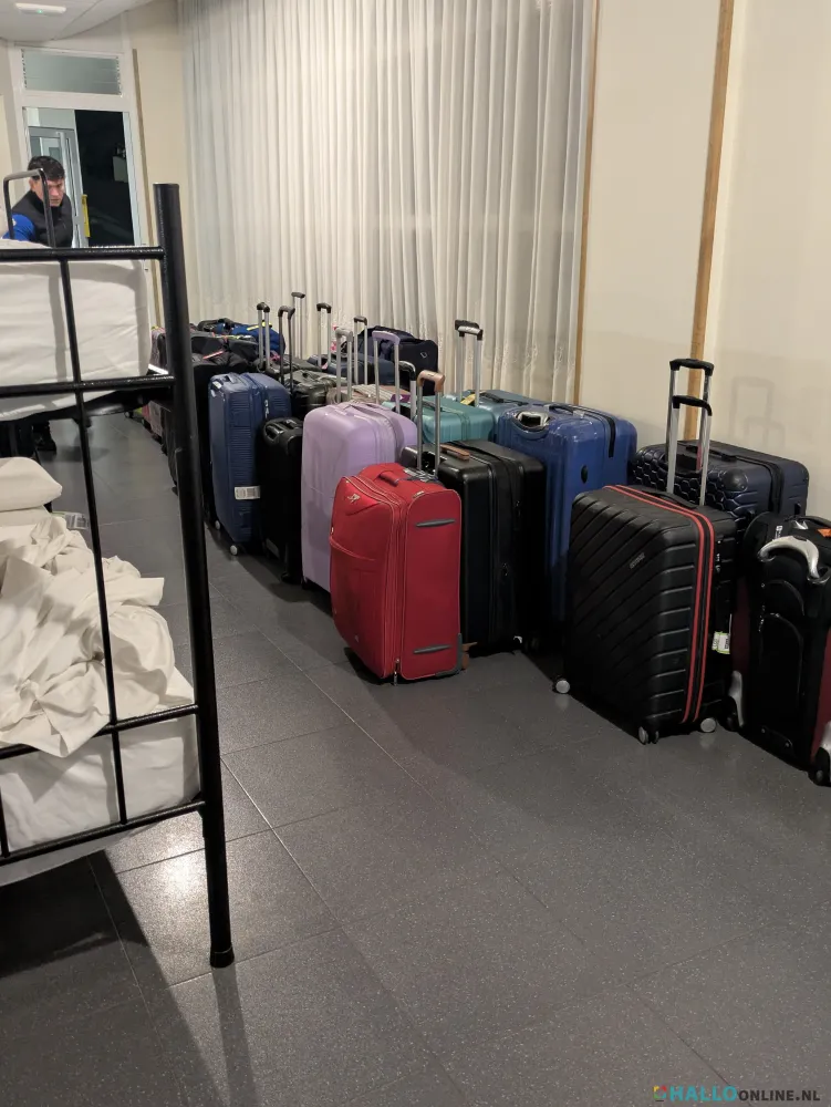 En dan.......in alle vroegte de invasie van de rolkoffers. Ja help het is de realiteit van dit moment! Een complete bus vol wordt leeggemaakt, en onze slaapruimte binnen geschoven. Onze traditionele "echte camino uitrusting" wordt letterlijk aan de kant geschoven. Red de rugzak het niet lang meer van de rolkoffers?