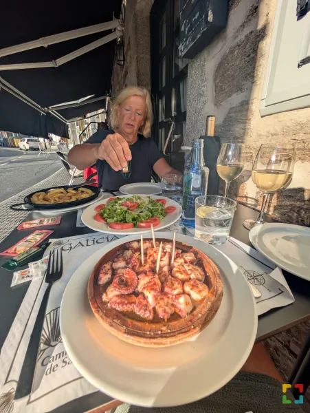 De mooie nazomerse avond sluiten we af op het terras van een mooi spaans eettentje met Pulpo. Octopus: de specialiteit van deze streek.