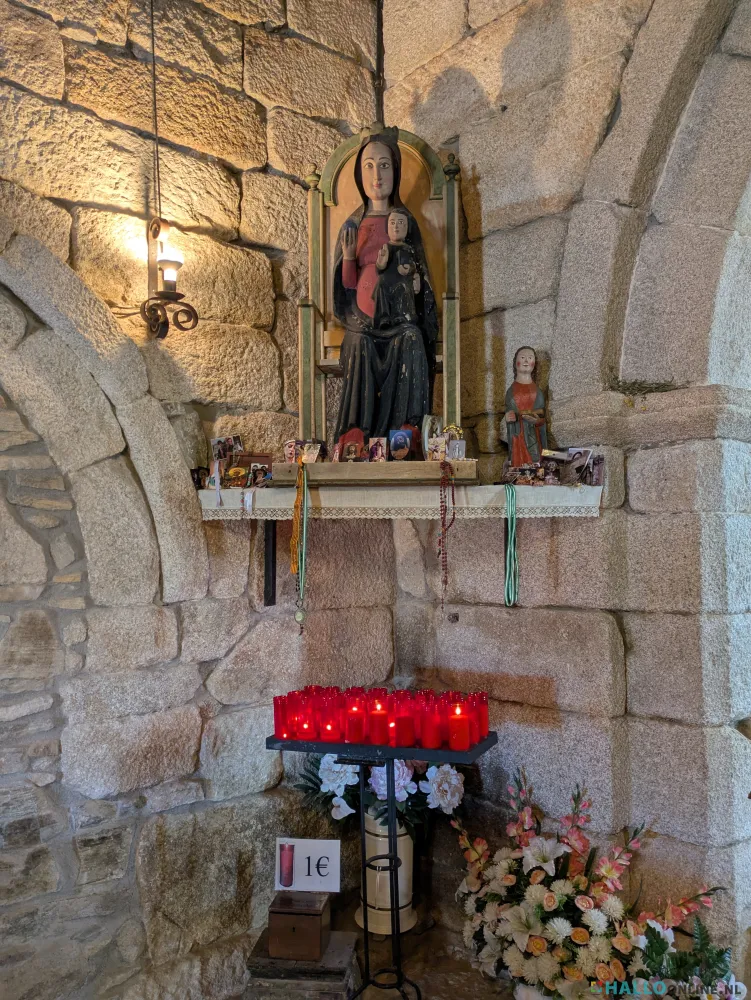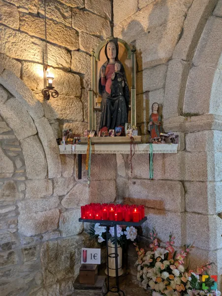 Pijnvrij is een groot woord. Het is verbazend hoe je gedachten zich steeds een weg vinden naar het ongemak en stukjes genieten dreigen weg te knabbelen. Ik ben niet de op enige strompelaar, met mij vele anderen. Het springt zo in het oog dat ik opmerk dat hier een afsplitsing naar Lourdes op z'n plaats zou zijn. Toch heeft ook deze dag z'n hele bijzondere momenten en deze vindt ik in een piepklein Maria kerkje uit de 14e eeuw.