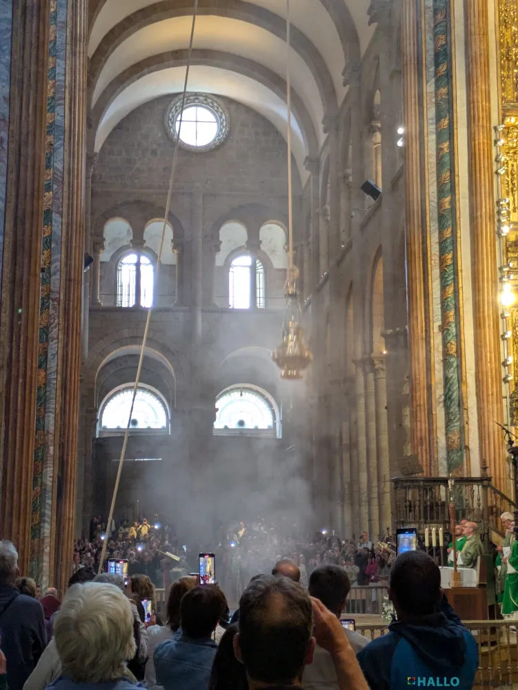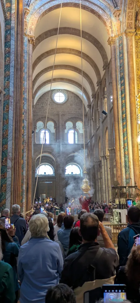 En dan......zonder dat hier vooraf melding van is gemaakt wordt de grote Botafumeiro in gebruik genomen. Het grote wierookvat, 60 kg zwaar, 1.60 m hoog, hangend aan een 35 meter lang touw dat alleen bij speciale feestdagen, gelegenheden, en op afkoop wordt gebruikt. Toch een aangrijpend moment als het wierookvat door 8 mannen omhoog getrokken wordt en vervolgens door de dwarsbeuk van de kathedraal gezwaaid wordt.