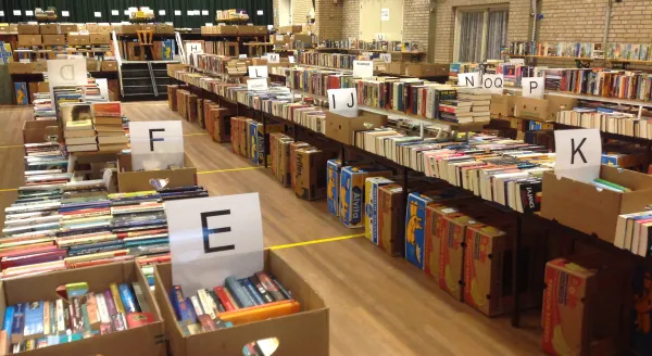 Deze markt staat in de regio bekend als zeer groot, erg goedkoop en uitstekend gesorteerd. Alle boeken/strips: € 2,50 p/kg Pinnen kan. Graag zelfs. Romans/Thrillers staan op schrijversalfabet. De boeken worden gepresenteerd in +60 categorieën.
