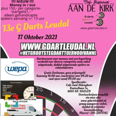 Stichting G Darts Leudal organiseert op zondag 17 oktober 2021 voor de 13e keer een darttoernooi voor mensen met een beperking.
