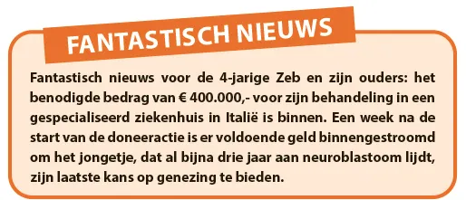 Fantastisch nieuws voor de 4-jarige Zeb en zijn ouders: het benodigde bedrag van € 400.000,- voor zijn behandeling in een gespecialiseerd ziekenhuis in Italië is binnen. Een week na de start van de doneeractieis er voldoende geld binnengestroomd om het jongetje, dat al bijna drie jaar aan neuroblastoom lijdt, zijn laatste kans op genezing te bieden.
