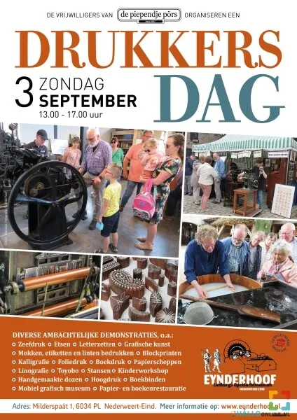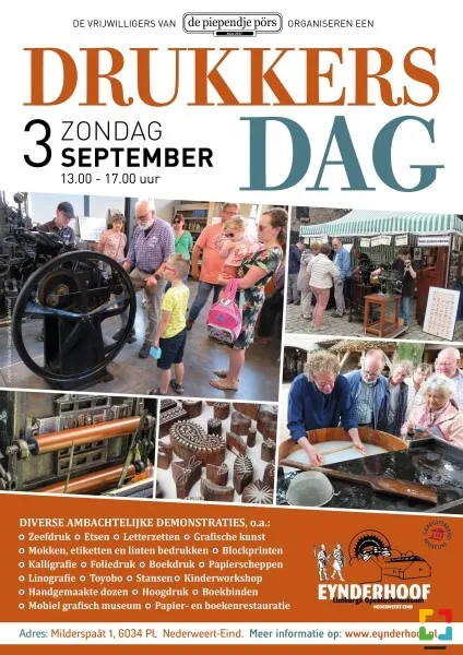 Zondag 3 september 2023 organiseert drukkersgroep ‘De Piependje Pörs’ voor de derde keer de ‘Drukkersdag’, een unieke themadag in het Limburgs Openluchtmuseum Eynderhoof in Nederweert-Eind met veel informatie over de ouderwetse boekdrukkunst en aanverwante ambachten. Van zelf papier maken tot boeken binden, van mooi schrijven (kalligraferen) tot letters zetten en diverse druktechnieken met echte geurende inkt. Een bijzondere middag in het leukste en meest leerzame openluchtmuseum van Zuid Nederland.