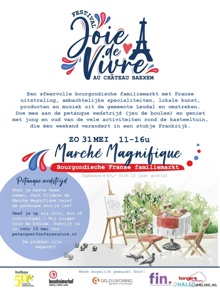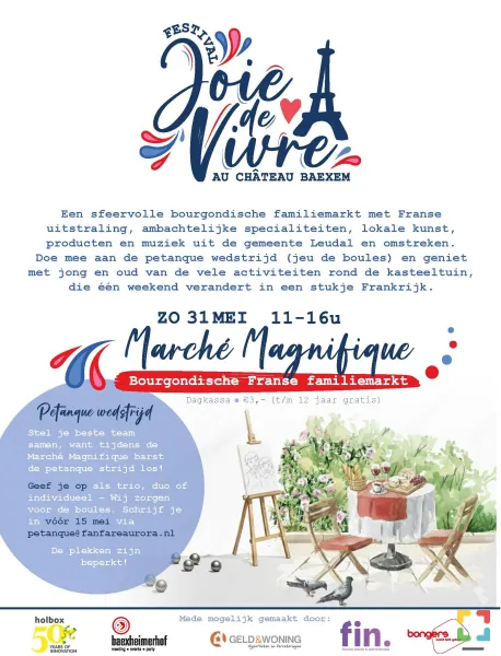 Met een feestelijke zaterdagavond vol muziek, zang en dans, een kunstzinnige, bourgondische familiemarkt op zondag én een sportieve petanque wedstrijd is Festival Joie de Vivre hét evenement dat Baexem laat bruisen. Een festival dat verbindt, verrast en inspireert – voor iedereen.