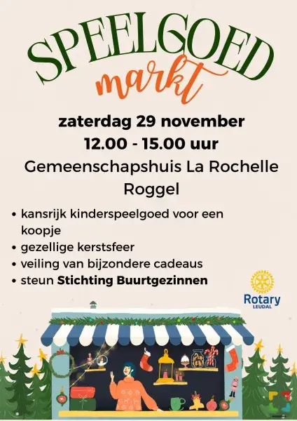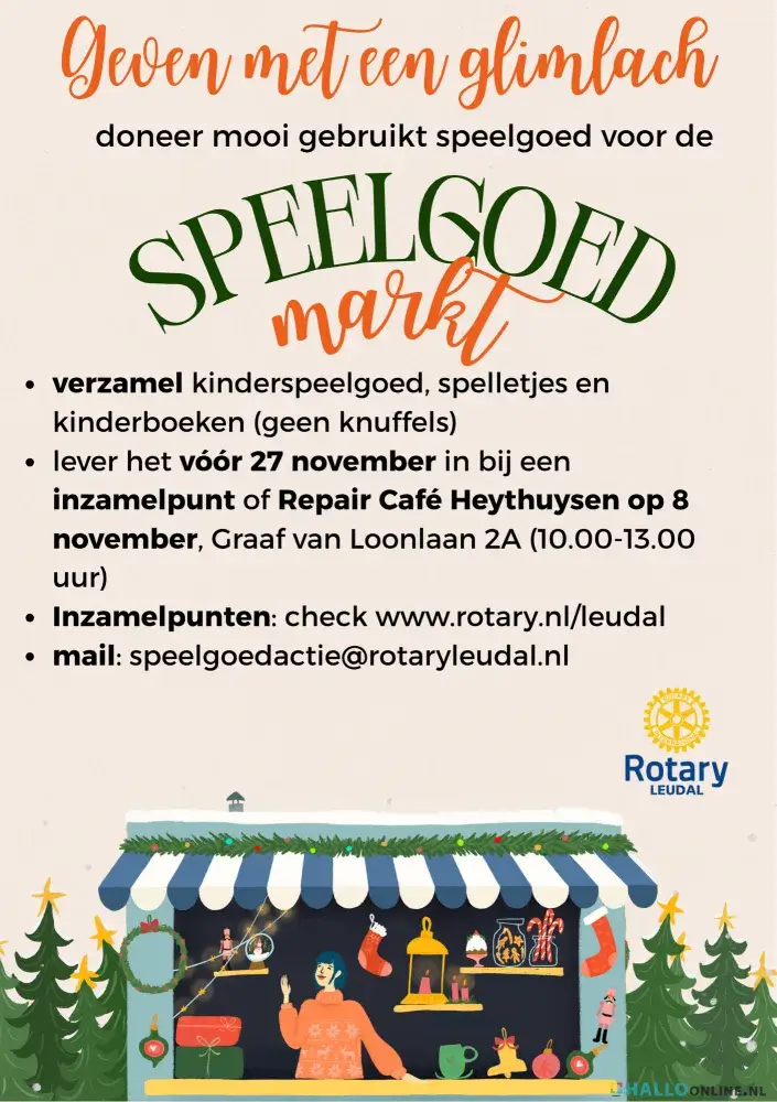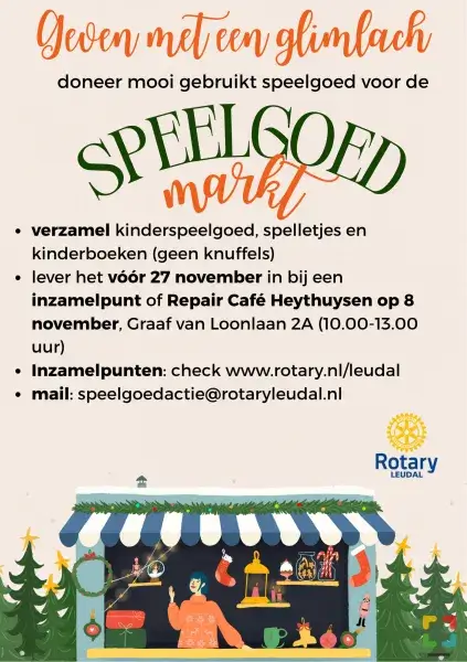 Rotary Leudal nodigt iedereen uit om bij te dragen — door speelgoed te doneren of de markt te bezoeken.