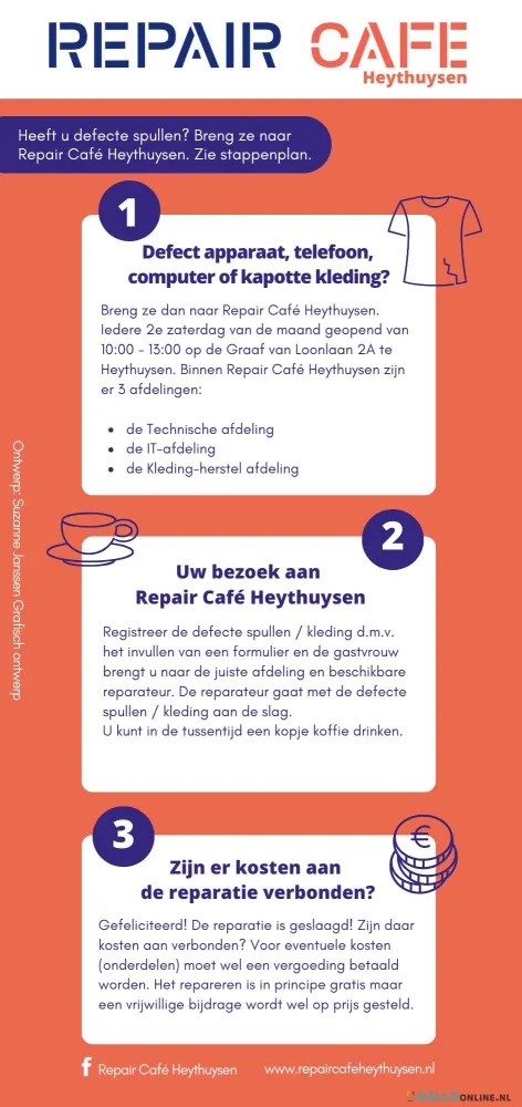 Defect apparaat, telefoon, computer of kapotte kleding? Breng ze dan naar Repair Café Heythuysen. Iedere 2e zaterdag van de maand geopend van 10:00 - 13:00 op de Graaf van Loonlaan 2A te Heythuysen. Binnen Repair Café Heythuysen zijn er 3 afdelingen: