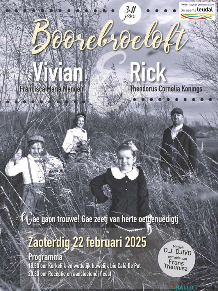 Nao ut kèrkelijk & wèttelijk huwelijk, zal vanaf 20.30u de receptie aanvange. De aovendj weurtj muzikaal begeleidj door DJ DJIVO en Frans Theunisz zal ein optreije verzörge. Ut belooftj dus weer ein knallendj fieëst te waere mit dit bruisendje broedspaar, dus zörg detj ge dur bie zeetj!