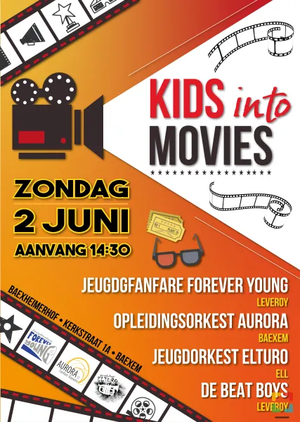 Kids into Movies is een concertmiddag van 3 jeugdorkesten uit de regio. Leveroy, Baexem en Ell hebben zich samengepakt en organiseren op zondag 2 juni vanaf 14.30 uur in Baexeimerhof een muzikale middag in het thema film.