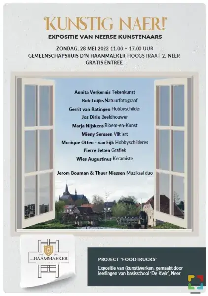 ‘Kunstig Naer!’ is een sfeervolle kunstexpositie, waar 9 Neerse kunstenaars zichzelf en hun werk presenteren. Er zijn ook (kunst)werken te zien, die leerlingen van basisschool ‘De Kwir’ maakten tijdens een project over foodtrucks. De hele dag zijn er optredens van het muzikale duo Jerom Bouman en Thuur Niessen.