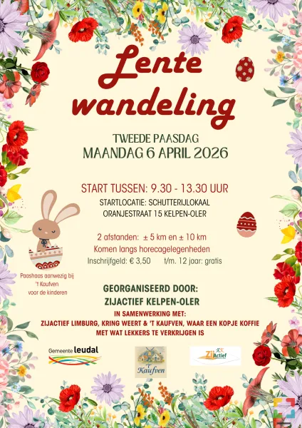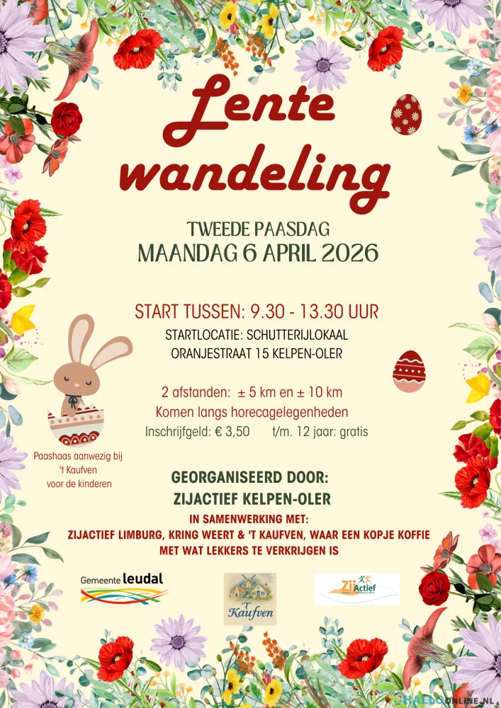 Na afloop is er in ’t Kaufven een kopje koffie/thee en iets lekkers te koop voor 1 euro. Dit wordt verzorgd door ZijActief Kelpen-Oler. Voor de kinderen is de Paashaas aanwezig.
