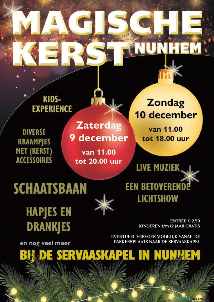 Dit evenement is toegankelijk voor iedereen op zaterdag 9 december tusen 11.00-20.00 uur en op zondag 10 december tussen 11.00-18.00 uur. De locatie is uiteraard rondom de Servaaskapel: Servaasweg 46, 6083 AS Nunhem.