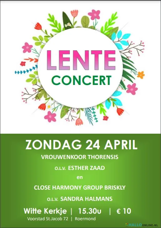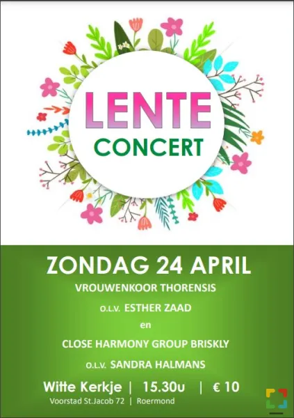 Close harmony group Briskly en vrouwenkoor Thorensis organiseren op zondagmiddag 24 april een gezamenlijk lenteconcert in het Witte Kerkje in Roermond. Het belooft een gevarieerd programma te worden waarin de unieke klanken van beide koren naar voren komen en elkaar tegelijkertijd mooi aanvullen. Wat de koren kenmerkt: Thorensis is een vrouwenkoor onder leiding van prijswinnend dirigente en pianiste Esther Zaad. Het koor heeft een gebalanceerde koorklank, spannende muzikaliteit en functionele koorregie in het licht-klassieke tot klassieke genre. Er wordt vierstemmig a capella of onder pianobegeleiding gezongen. O.a. werken van Gjeilo, Quartel, Mendelssohn, Elgar en Keen staan op het programma. Briskly (vrij vertaald: “levendig”) is een close harmony group met 20 enthousiaste zangers in de stemsoorten sopraan, mezzosopraan, alt, tenor en bas. Het koor dat in 1989 is opgericht, staat onder leiding van Sandra Halmans uit Roermond. Zij studeerde aan het conservatorium in Tilburg, heeft een eigen muziekpraktijk en is dirigente van verschillende koren. Briskly staat bekend om haar warme, sprankelende klanken die a capella worden gezongen. Op het programma staan o.a. werken van Cold Play, Boublil and Schönberg en George Gershwin.