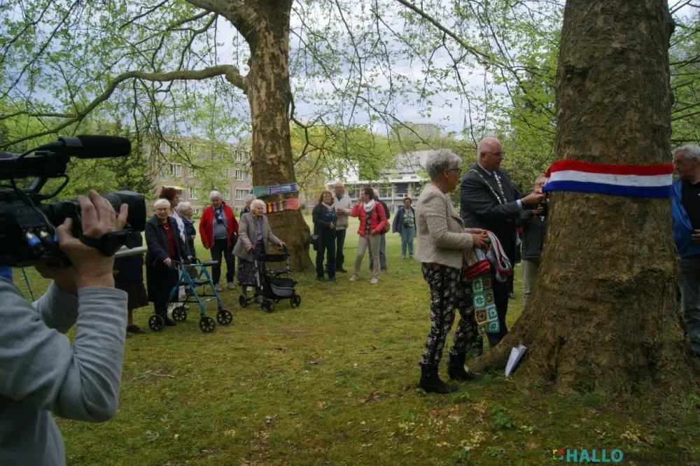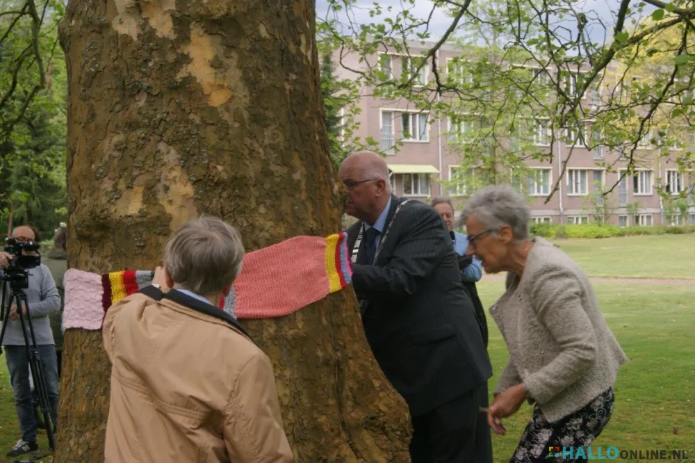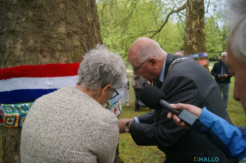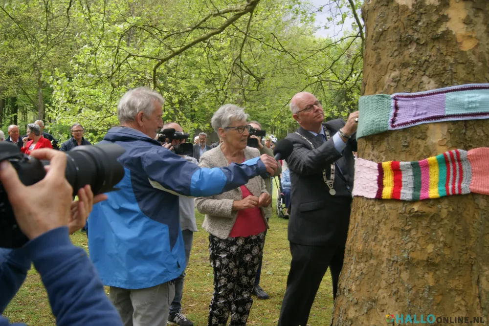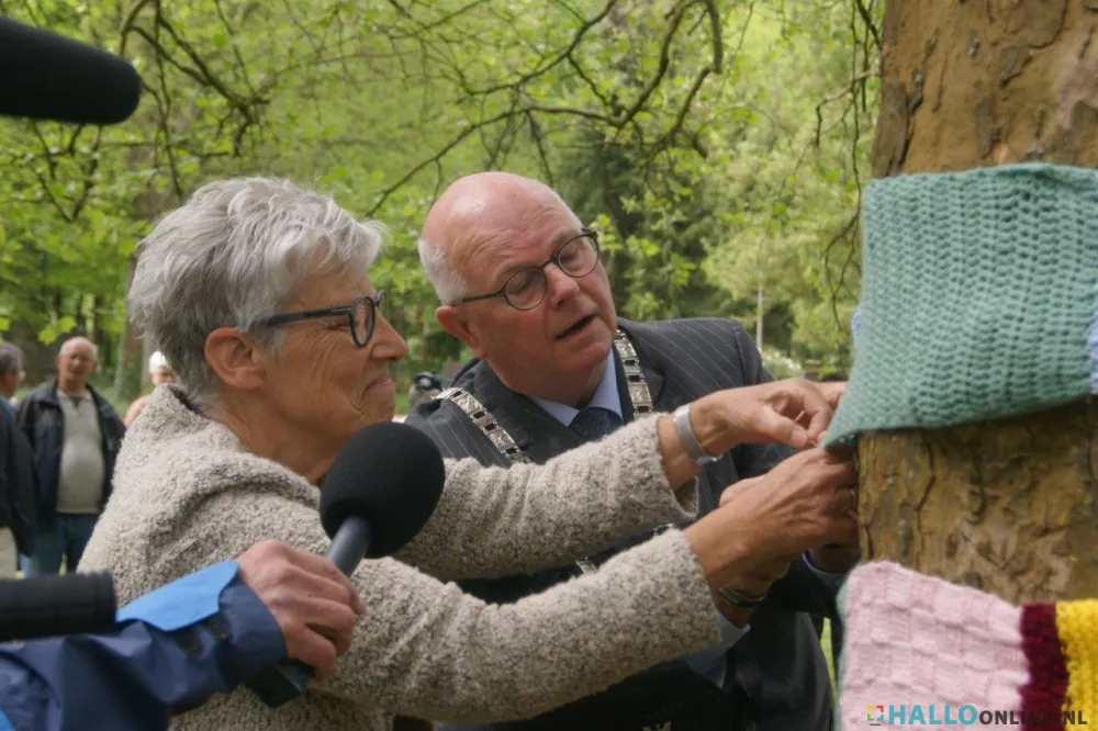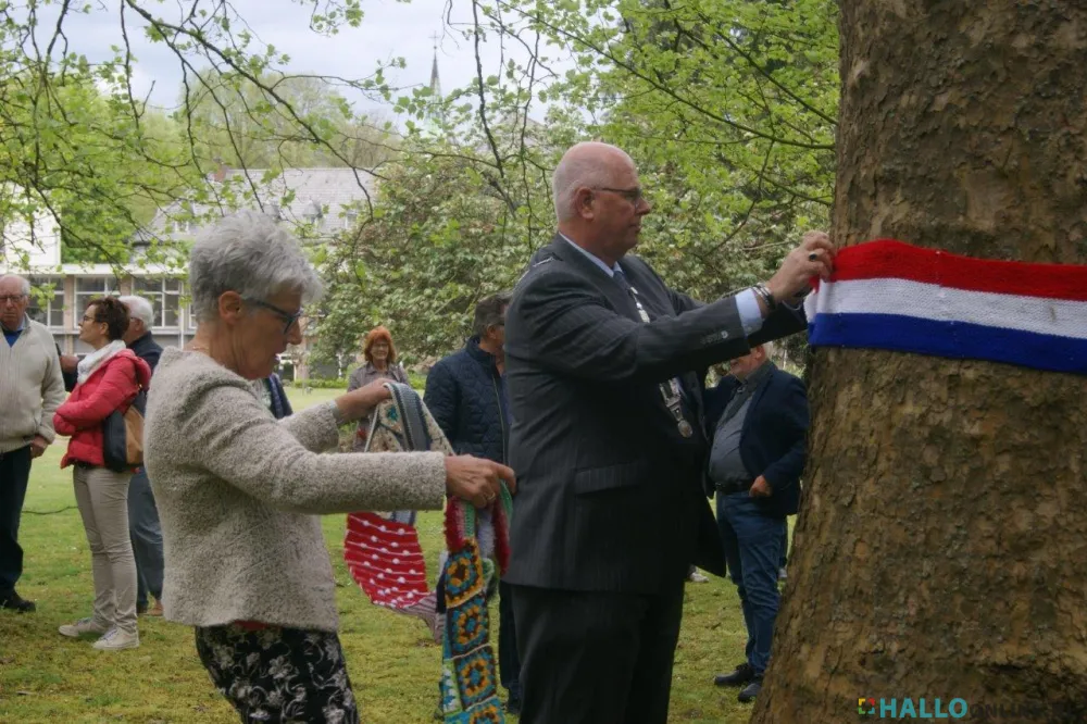 Burgemeester Arno Verhoeven van de gemeente Leudal heeft donderdagmiddag 25 april jl. de eerste gebreide lapjes van het project ‘Wij geven kleur aan de vrijheid’ bij het Pesthuisje St. Elisabeth te Haelen aan de boom bevestigd.