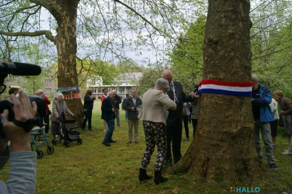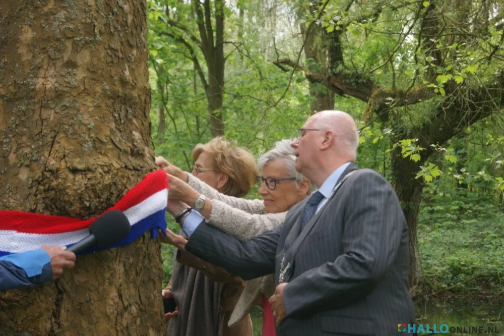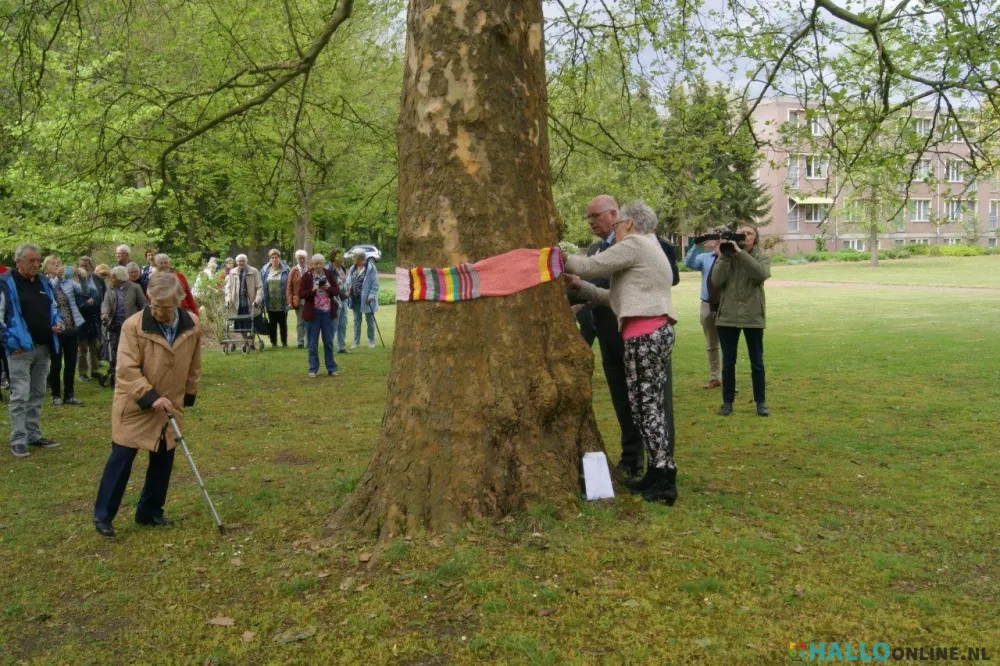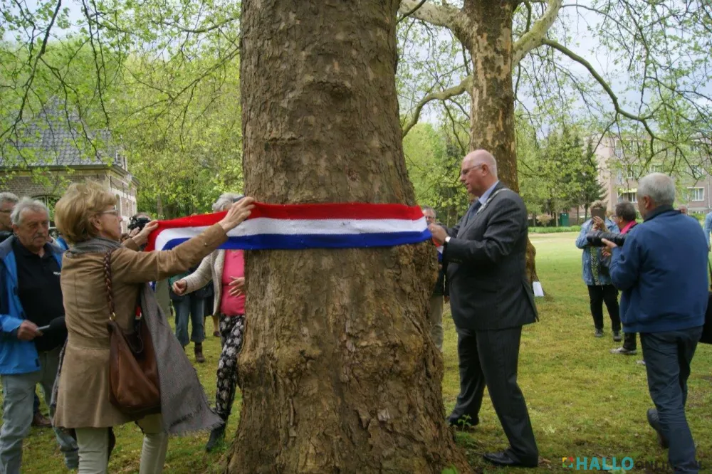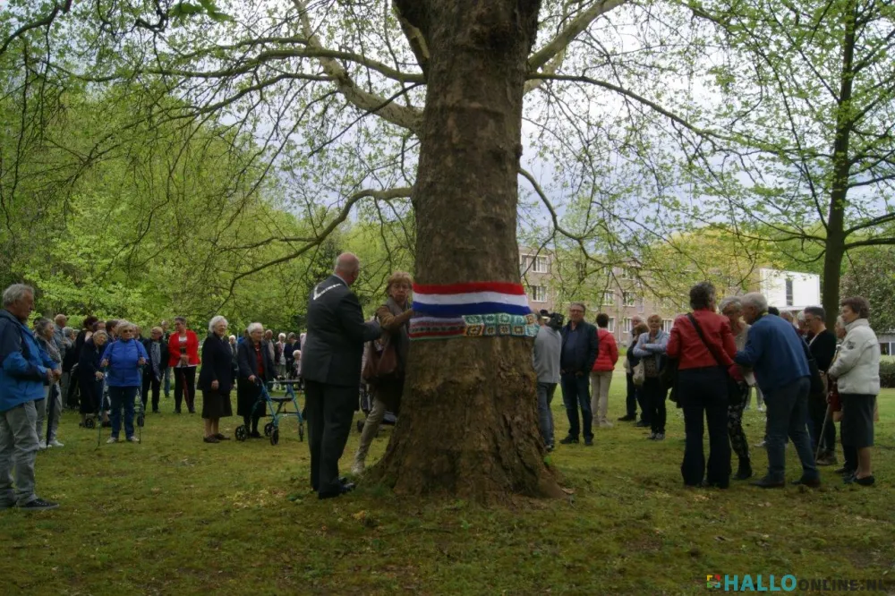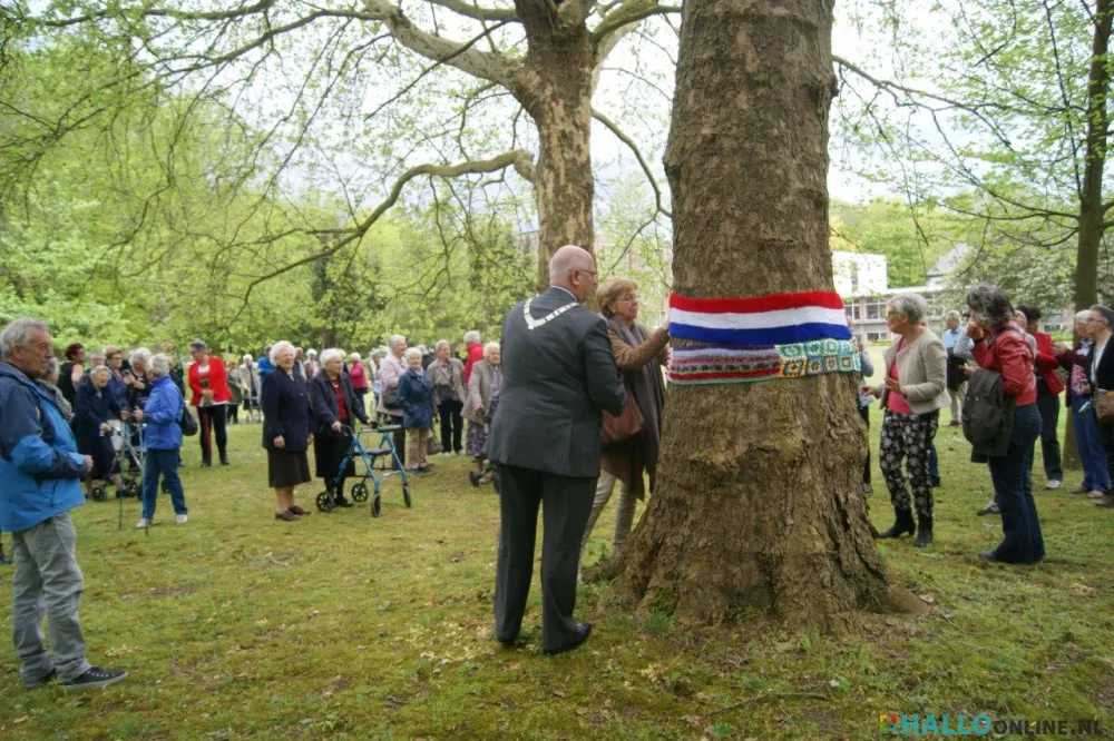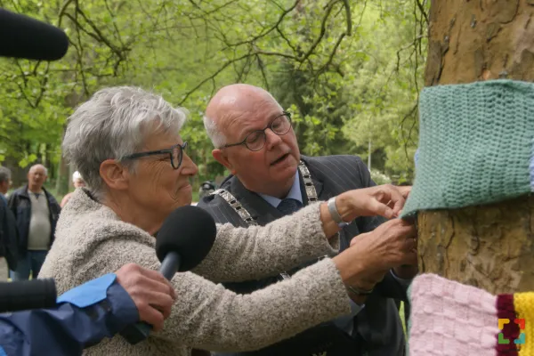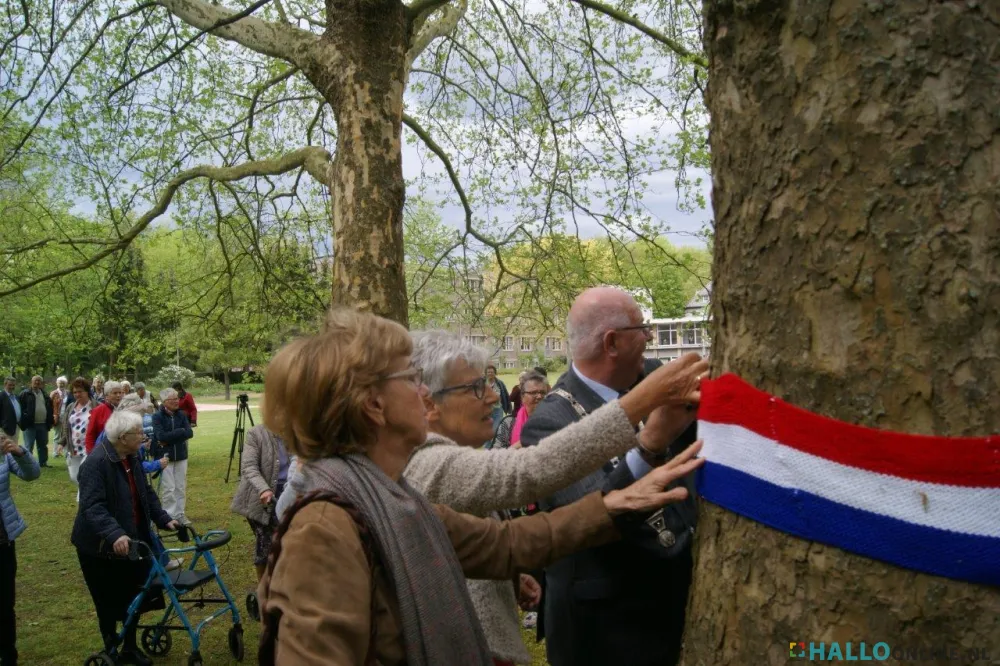 Burgemeester Arno Verhoeven van de gemeente Leudal heeft donderdagmiddag 25 april jl. de eerste gebreide lapjes van het project ‘Wij geven kleur aan de vrijheid’ bij het Pesthuisje St. Elisabeth te Haelen aan de boom bevestigd.