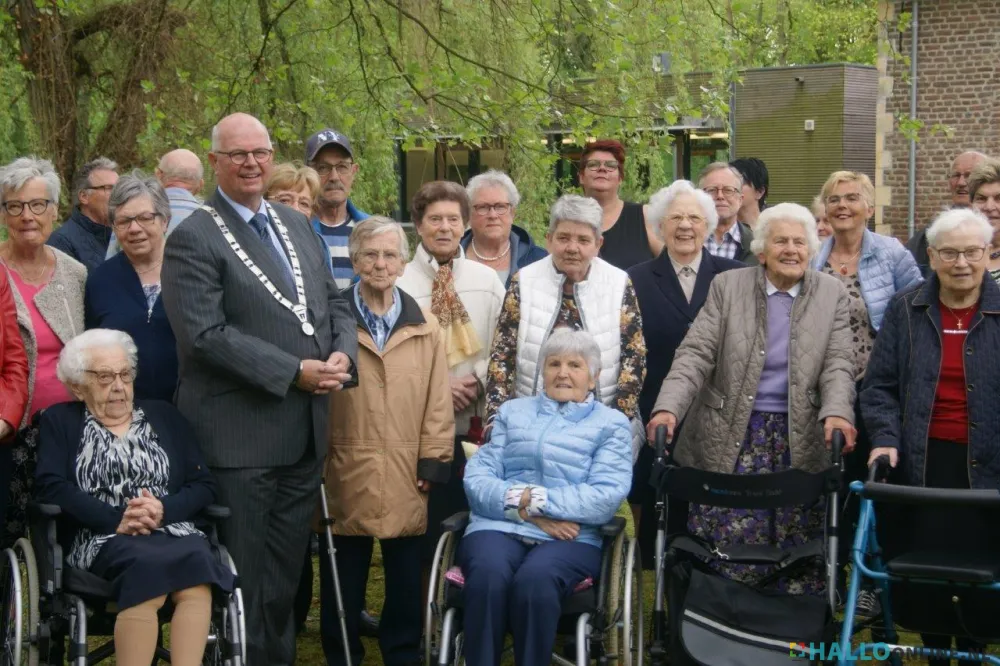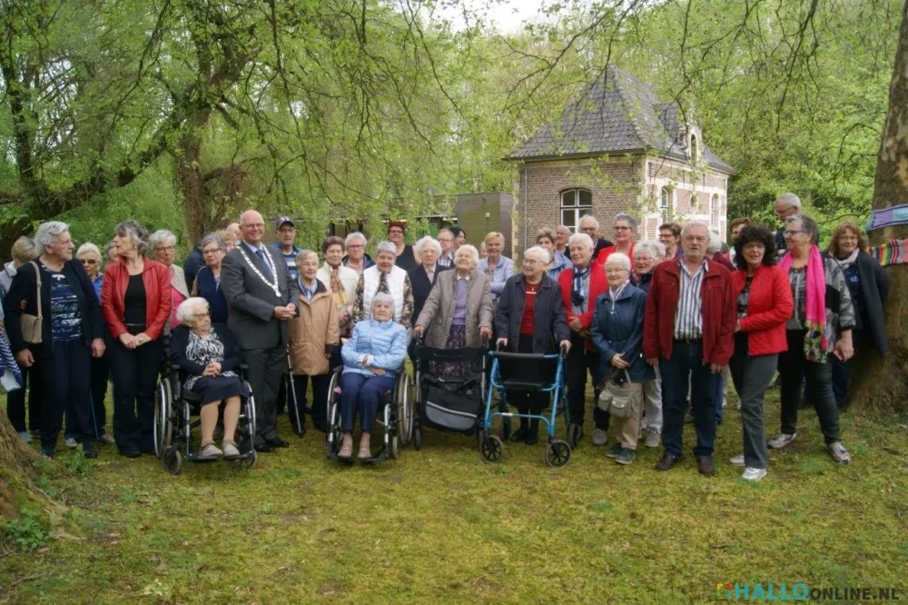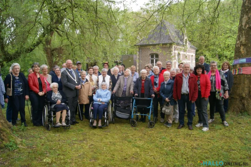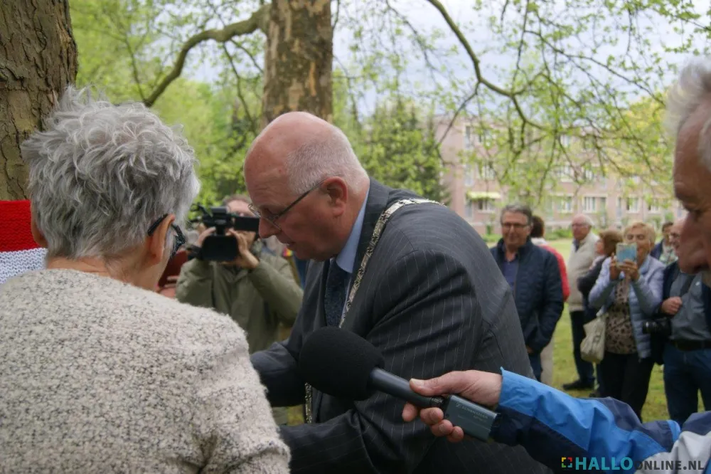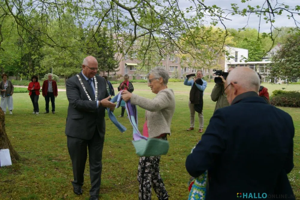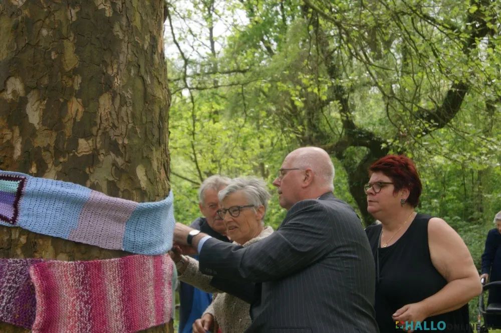 Burgemeester Arno Verhoeven van de gemeente Leudal heeft donderdagmiddag 25 april jl. de eerste gebreide lapjes van het project ‘Wij geven kleur aan de vrijheid’ bij het Pesthuisje St. Elisabeth te Haelen aan de boom bevestigd.
