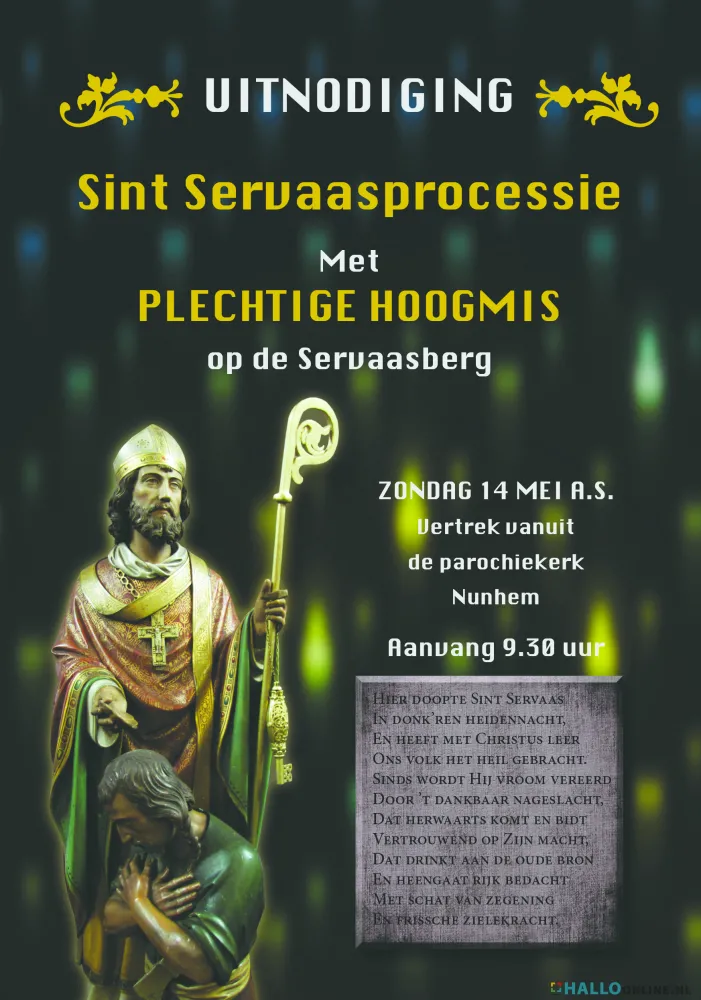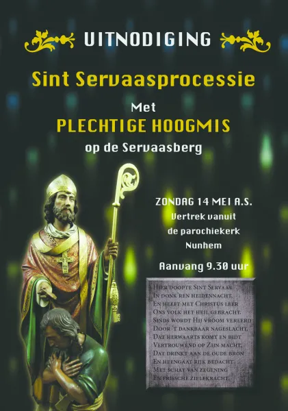 Op processie zondag viert de parochie Nunhem en allen die zich daarbij willen aansluiten haar patroonheilige: Sint Servatius, bisschop en belijder. Die viering gaat terug op een eeuwenoude traditie. En juist omdat het oude geloof in die ene ware God telkens opnieuw wordt beleefd, kan deze traditie zich blijven handhaven.