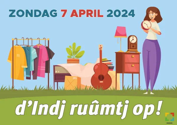 Op zondag 7 april 2024 van 10.00 tot 15.00 uur vindt de derde editie plaats van de rommelroute “d’Indj ruûmtj op!”. Inwoners van Eind verkopen tweedehands spullen vanuit hun tuin, oprit of garage.