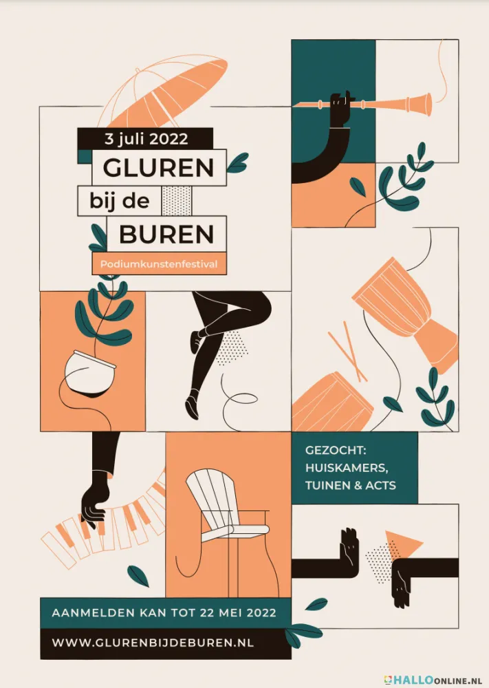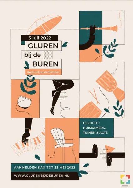 Aanmelden is mogelijk tot en met 22 mei via www.glurenbijdeburen.nl Gluren bij de Buren wordt georganiseerd door Stichting de Bühne in samenwerking met Marjolijn Peeters, Cultuurcoach bij ECI Cultuurfabriek.