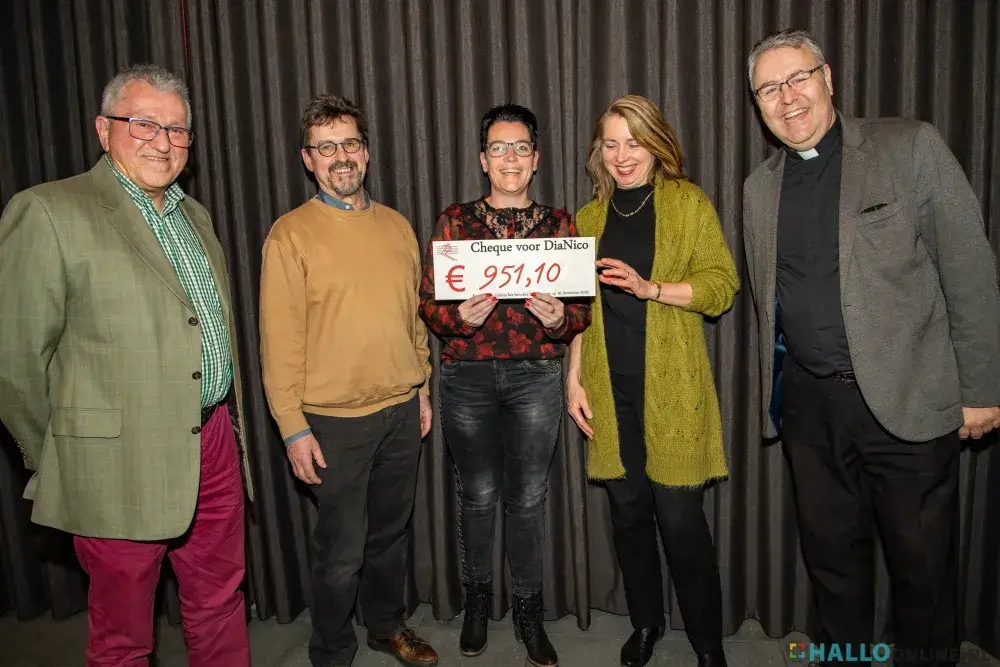 Tijdens de repetitie op dinsdag 18 december overhandigde het koor een cheque van € 951,10 aan pastoor Marcus Vankan van de parochiecluster Tabor en enkele vrijwilligers van DiaNico. Dit resultaat voor DiaNico was een steuntje in de rug voor iedereen die dit kan gebruiken.