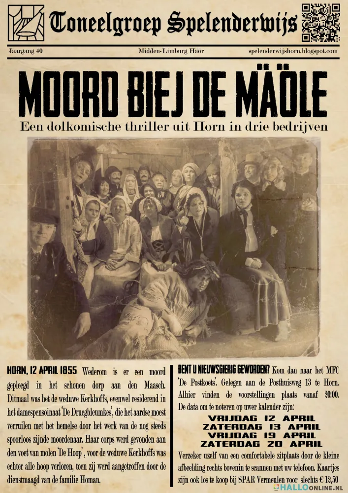 HORN:Toneelgroep Spelenderwijs bracht in 2023 een succesvolle komedie op de planken. Ook dit jaar gaat Spelenderwijs ervoor om ons publiek weer een heerlijke avond uit te bezorgen met de nodige humor. De regisseur heeft aan dit stuk niet alleen humor maar ook de nodige spanning toegevoegd door samen met de groep te kiezen voor: