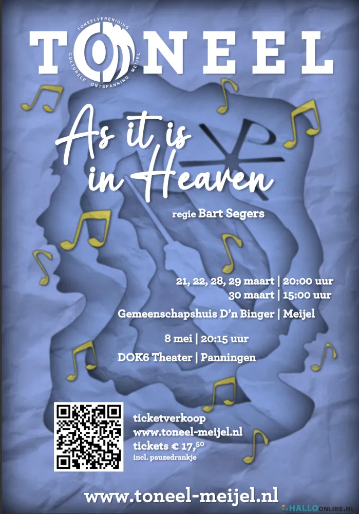 Dit voorjaar brengt toneelvereniging C.O.M. Meijel een indrukwekkend theaterstuk op de planken: As it is in Heaven, naar de gelijknamige Zweedse film uit 2004. Onder regie van Bart Sergers komt dit ontroerende verhaal over muziek, verandering en menselijke relaties tot leven.