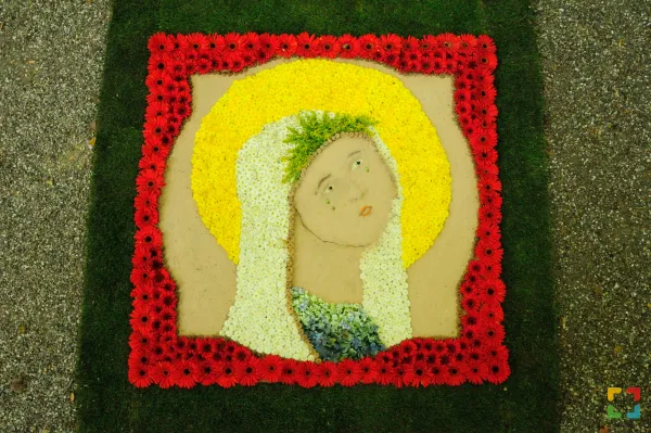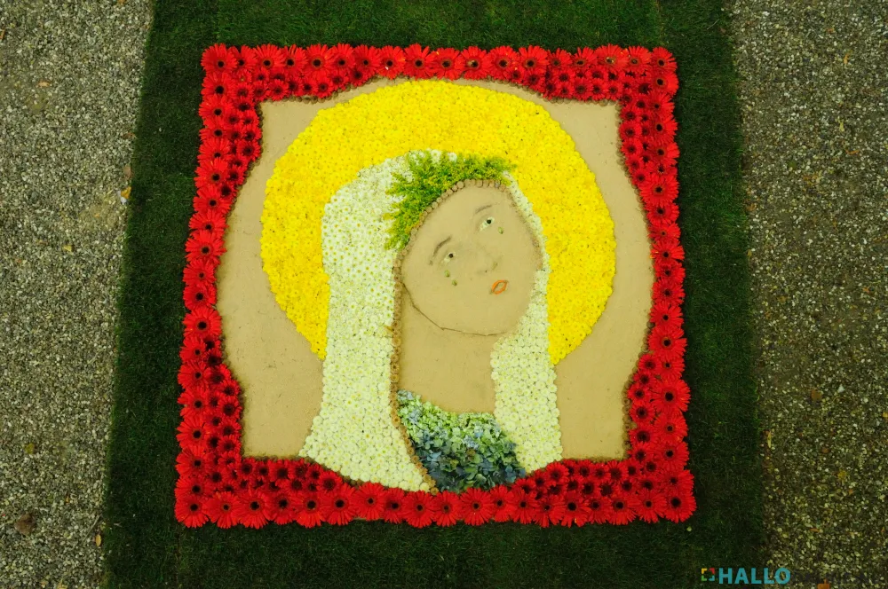 Het bloemtapijt wordt ieder jaar gelegd ter ere van ” ’t Besjloet “, het einde van het bedevaart seizoen. Het onderwerp dit jaar is : De Kerkelijke Kalender, waarbij kerkelijke feesten door het jaar heen worden uitgebeeld in bloemen en bijmaterialen die gratis verstrekt zijn door bloemisten en kwekers uit Midden-Limburg.