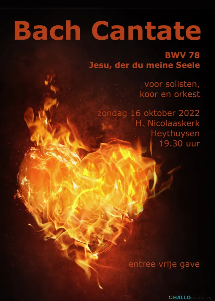 Op zondag 16 oktober zal er weer een uitvoering zijn van een cantate van Bach in de Nicolaaskerk te Heythuysen. Koor, orkest en solisten van Bach Cantates Heythuysen brengen dan cantate BWV 78 ten gehore.