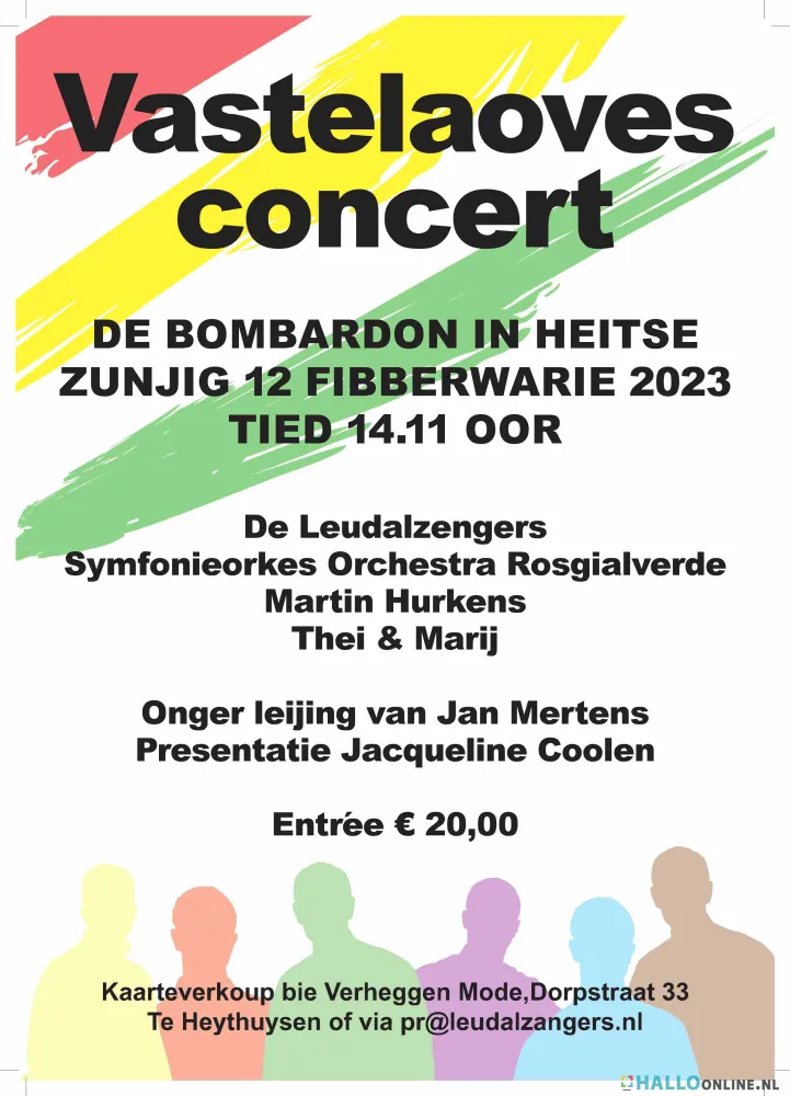 Op Zondag 12 februari 2023 om 14.11 uur is cultuurcentrum De Bombardon in Heythuysen weer het decor van het Vastelaoves concert van Mannenkoor De Leudalzangers en het uit internationale muzikanten samengestelde Symfonie Orchestra Rosgialverde. Na alle eerdere succesvolle concerten en de telkens uitverkochte zaal is ook deze editie weer een mix van bekende internationale melodieën en carnavalsschlagers uitgevoerd met klassieke flair en Limburgse schwung.