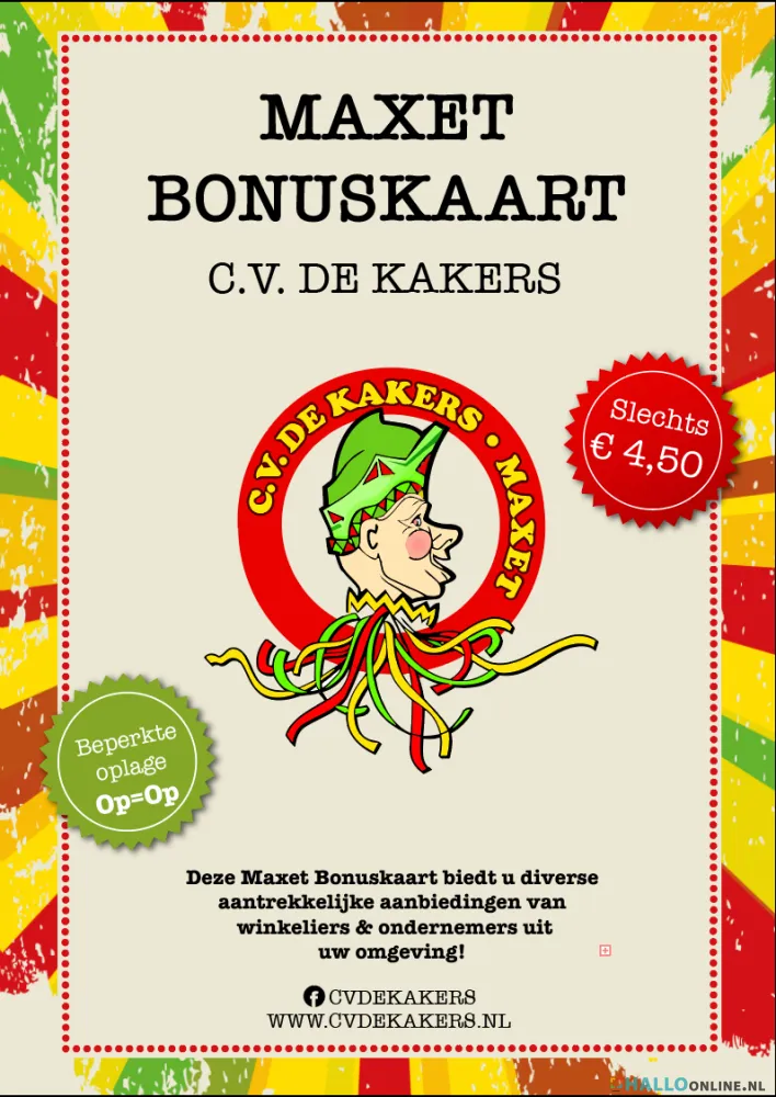 Verkoop Maxet Bonuskaart in omgeving Heythuysen en Leveroy CV de Kakers verkoopt op 26 oktober de Maxet Bonuskaart weer deur aan deur. Na het overweldigende succes van de eerste editie in 2018, komt CV de Kakers ook dit jaar weer terug met de Maxet Bonuskaart.