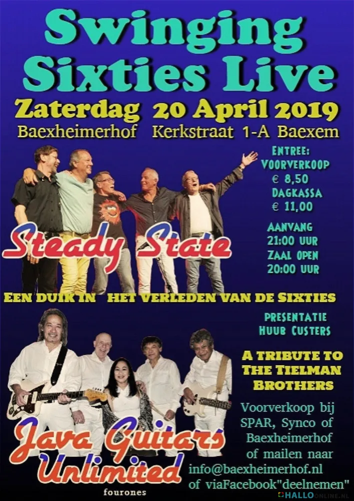 Baexheimerhof is zaterdag 20 april 2019 het decor voor Swinging Sixties Live, een avondvullend programma met live muziek uit de zestiger jaren door STEADY STATE, met als speciale gasten THE JAVA GUITARS UNLIMITED.