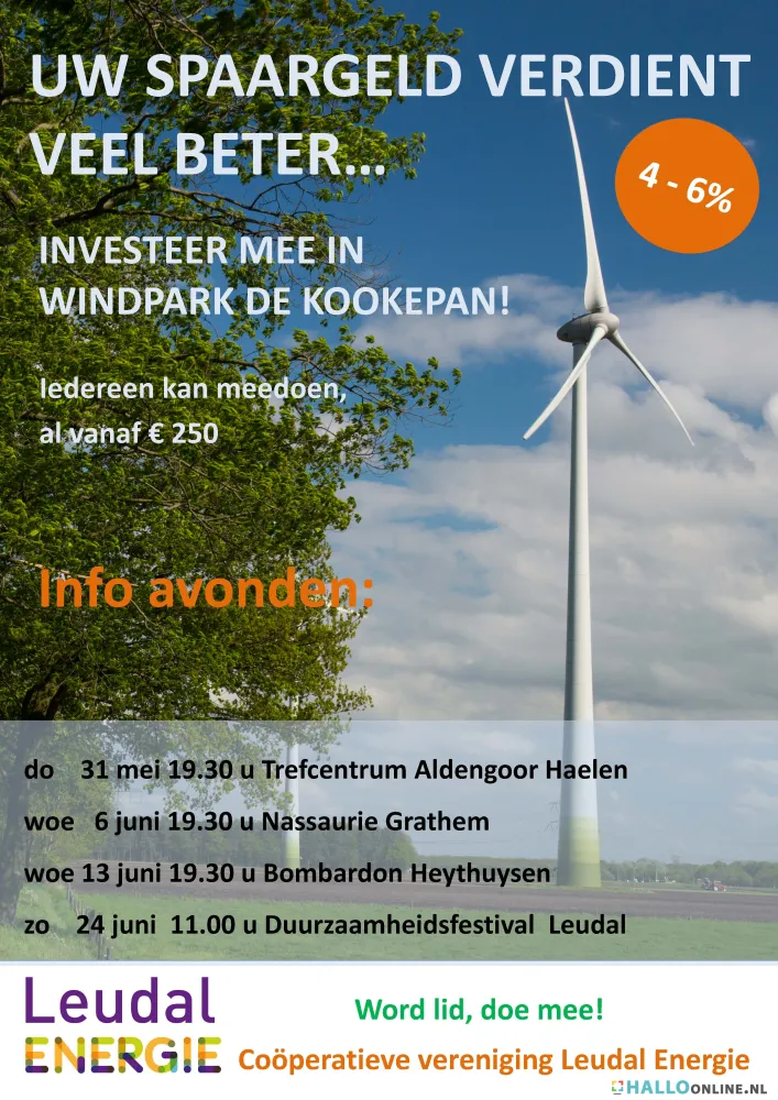 Binnenkort gaat de Energiecoöperatie Leudal Energie een heus windpark oprichten nabij het dorp Neer, waar de inwoners van Leudal op meerdere wijze van kunnen profiteren: Windpark De Kookepan. Door lid te worden van de coöperatie kunnen de inwoners meebeslissen over het toekomstige energiegebruik in de gemeente, maar ook deelnemen in het windpark. Dat betekent dat je geld uitleent aan de coöperatie, wat gebruikt wordt voor de bouw van de molens. Je ontvangt daarvoor 4% tot 6% rente, vijf tot 15 jaar lang.