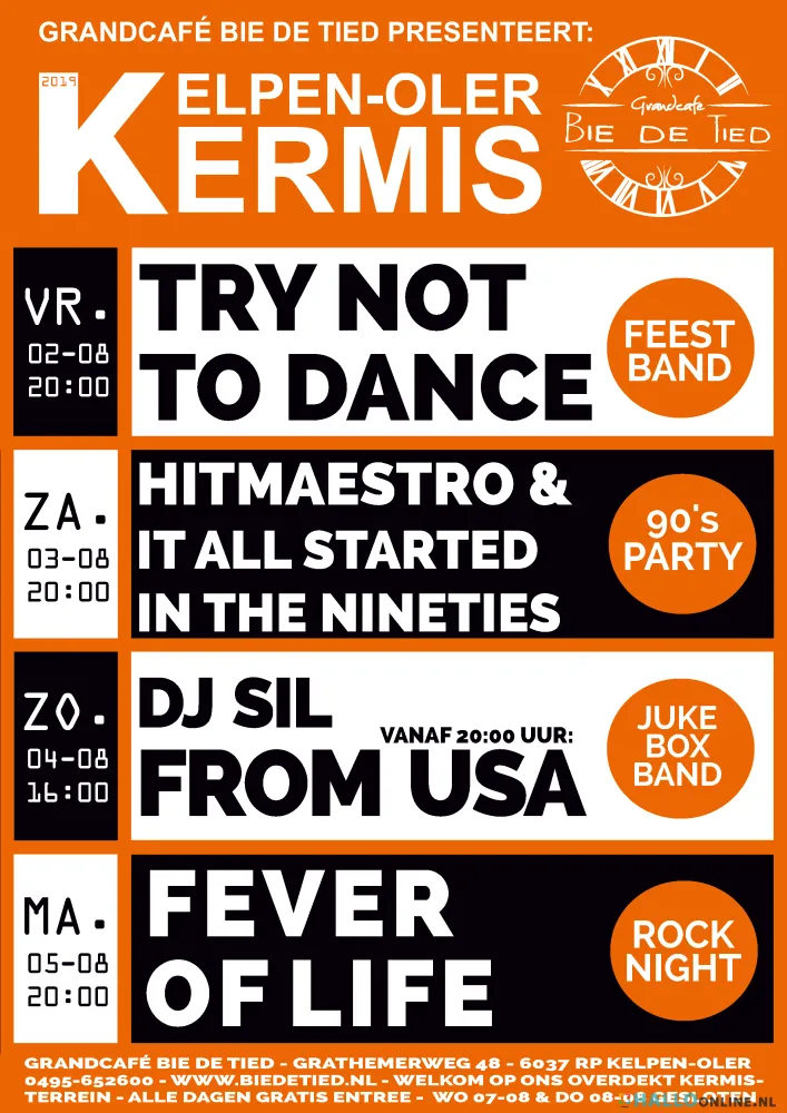 Maandagavond (vanaf 20:00 uur) is Rock Night! Fever Of Life zal Kelpen-Oler Kermis op een geweldige wijze afsluiten. Deze band uit regio Roermond heeft maar één doel: publiek herinneren aan de muziek uit de jaren 70 en 80. Nummers van onder andere Status Quo, Ram Jam, The Knack, The Rolling Stones, The Beatles, Dire Straits behoren tot het repertoire van Fever of Life.