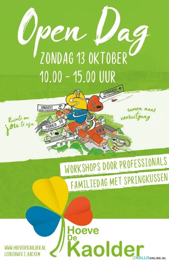Graag verwelkomen we u op Hoeve de Kaolder, Leukerweg 3 in Baexem tijdens onze open dag op 13 oktober. Voor meer info, bel gerust op nummer 0475-451701 of kijk op onze site www.hoevedekaolder.nl