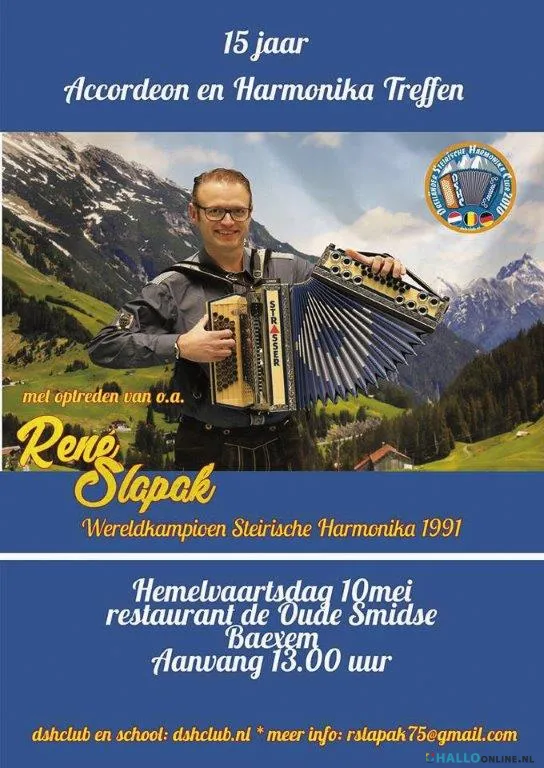 Op Hemelvaartsdag 10 mei 2018 organiseert Truus Poels voor de 15e keer het accordeon en harmonicatreffen in Baexem en op deze dag staat de Oude Smidse weer in het teken van de trekzak muzikant met zijn liederen en songs uit vele landen van Europa.