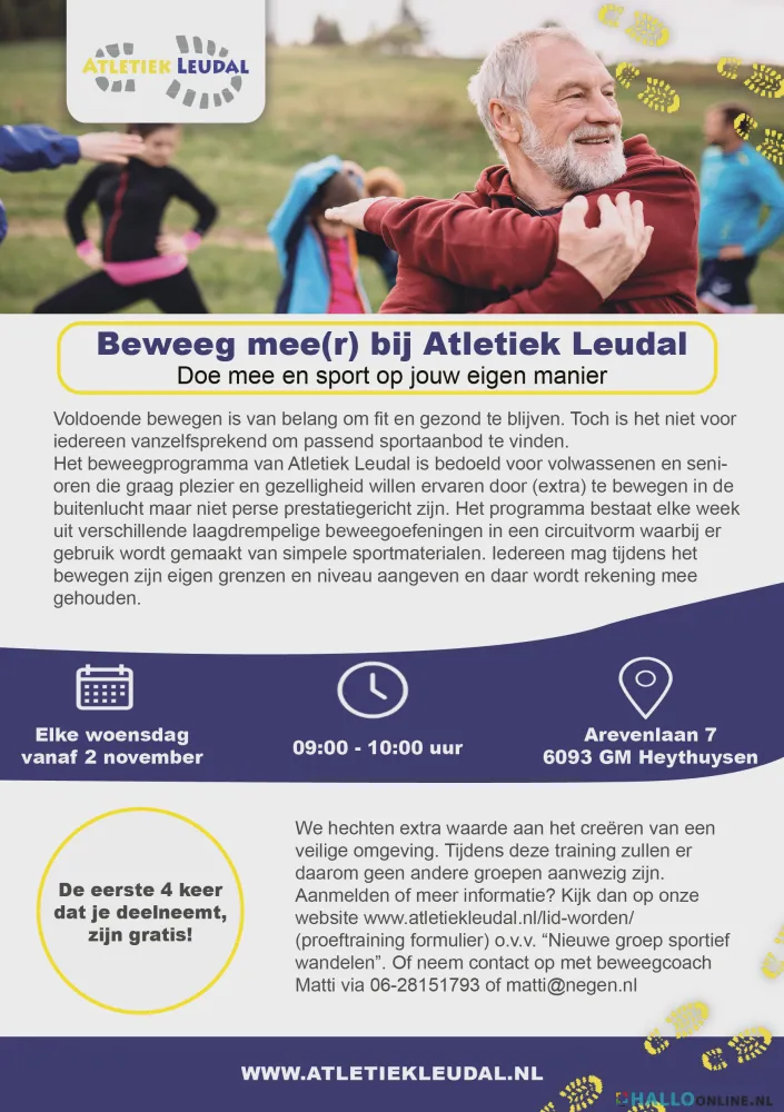 De trainingen starten op woensdag 2 november van 09:00 tot 10:00 uur. Vervolgens bewegen we elke woensdagochtend op te atletiekbaan van Atletiek Leudal (Arevenlaan 7, 6093 GM Heythuysen). De eerste 4 training die je volgt, zijn gratis. Aanmelden of meer informatie ontvangen. Ga dan naar onze website https://www.atletiekleudal.nl/lid-worden/ (proeftraining formulier) à o.v.v. “Nieuwe groep sportief wandelen”. U kunt ook eenvoudig contact opnemen met beweegcoach Matti van den Elzen via matti@negen.nl of 06-28151793.