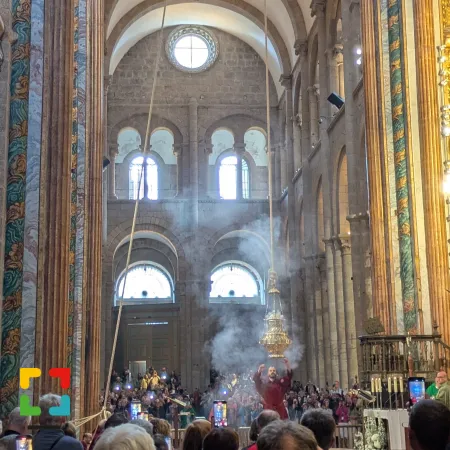 En dan......zonder dat hier vooraf melding van is gemaakt wordt de grote Botafumeiro in gebruik genomen. Het grote wierookvat, 60 kg zwaar, 1.60 m hoog, hangend aan een 35 meter lang touw dat alleen bij speciale feestdagen, gelegenheden, en op afkoop wordt gebruikt. Toch een aangrijpend moment als het wierookvat door 8 mannen omhoog getrokken wordt en vervolgens door de dwarsbeuk van de kathedraal gezwaaid wordt.