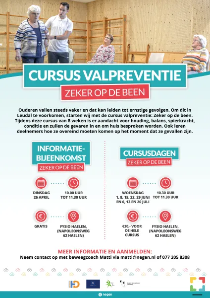Ouderen lopen grotere risico’s om te vallen, wat kan leiden tot ernstige gevolgen. Om dit in Leudal te voorkomen organiseert beweegcoach Matti een cursus valpreventie: Zeker op de Been voor senioren. Op dinsdag 26 april vindt er, in samenwerking met Dieet en Leef en Fysio Haelen, een gratis informatiebijeenkomst voor de cursus plaats.